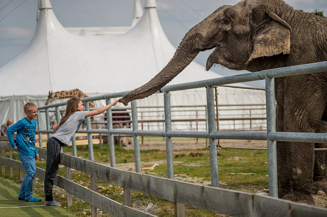 Visitors with an elephant at a circus and zoo in Germany. Germany, 2016. Jo-Anne McArthur / Born Free Foundation