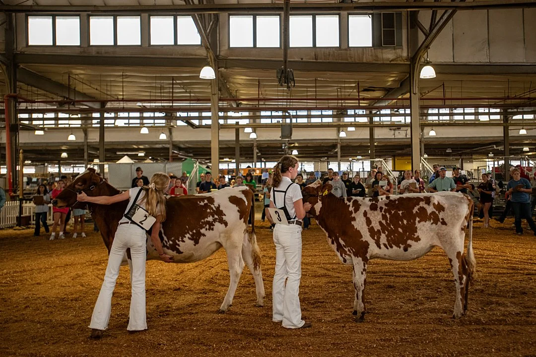 “Initiatives such as the US’s 4H programme encourage children to raise baby animals before taking them to slaughter.“ A pair of dairy cows are presented by youth at a large agricultural fair during a 4-H learning session. New York State Fair, Syracuse, New York, USA, 2024. Jo-Anne McArthur / Woodstock Farm Sanctuary /