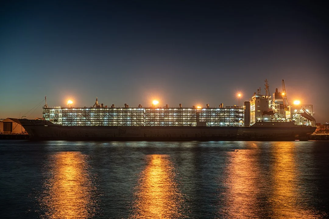 The machine churns on. A livestock export ship bound for the Middle East leaves a port with 60,000 animals on board. Australia, 2018. Gav Wheatley / HIDDEN / We Animals